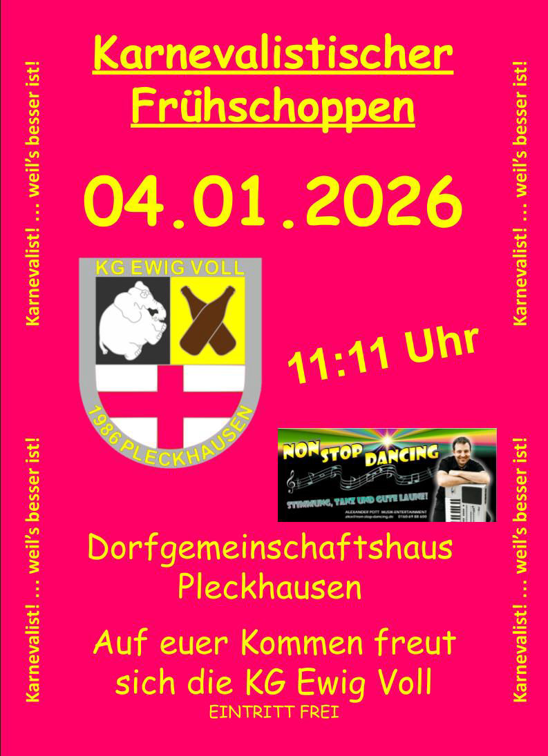 Karnevalistischer Frühschoppen; Veranstalter: KG Ewig Voll Plägese; Veranstaltungsort: Dorfgemeinschaftshaus Pleckhausen
