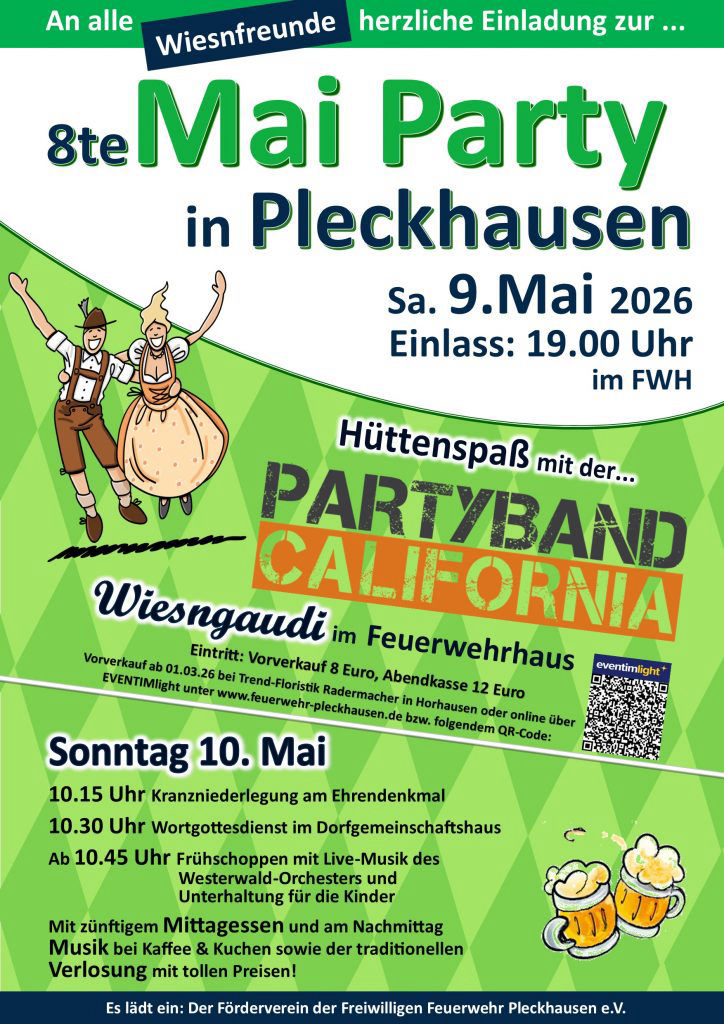 8 te. Mai-Party; Veranstalter: Förderverein der Freiwilligen Feuerwehr Pleckhausen e.V.; Veranstaltungsort: